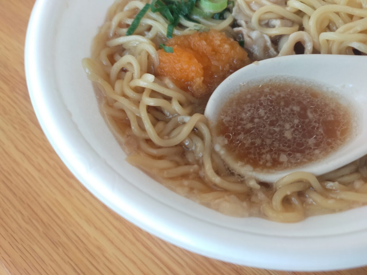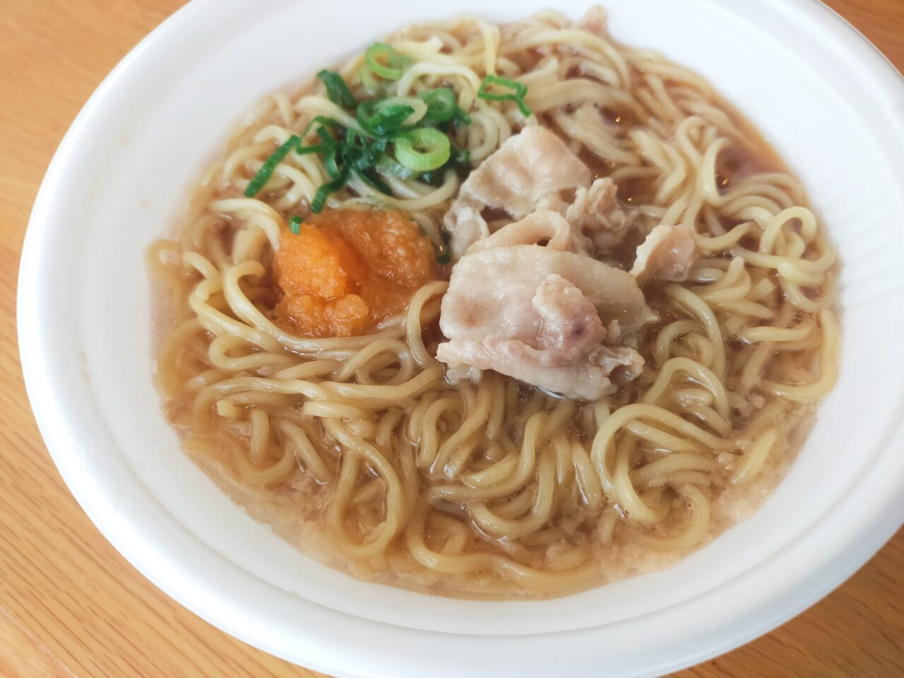 やわらかな豚肉と柚子こしょうおろしとねぎがトッピングに。何度も店舗で肉そばを食べたことがありますが、お店の味そのままで、まさに“まるでお店の一杯!”です。