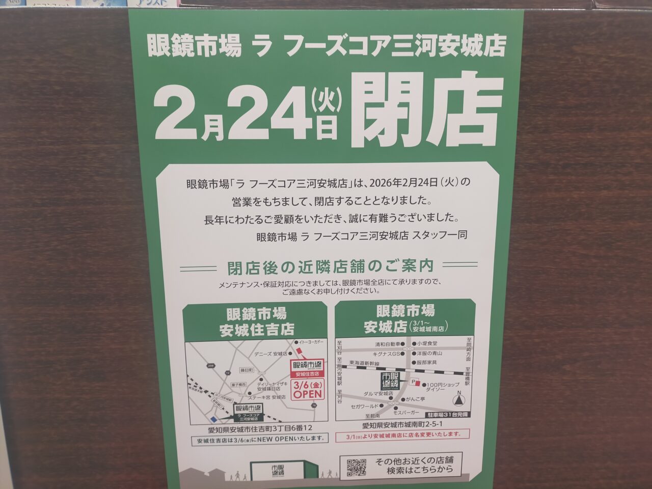ピアゴラフーズコア三河安城店の2階にある、「眼鏡市場 ラフーズコア三河安城店」さんが、2026年2月24日(火)の営業をもって閉店されるそうで、お知らせが出ています。