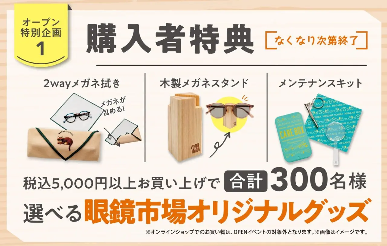 期間中、5,000円(税込)以上購入すると、お好きな眼鏡市場オリジナルグッズを選べます。