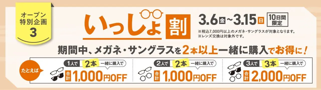期間中、メガネ・サングラスを2本以上一緒に購入すると、購入本数に応じた特典が受けられます。