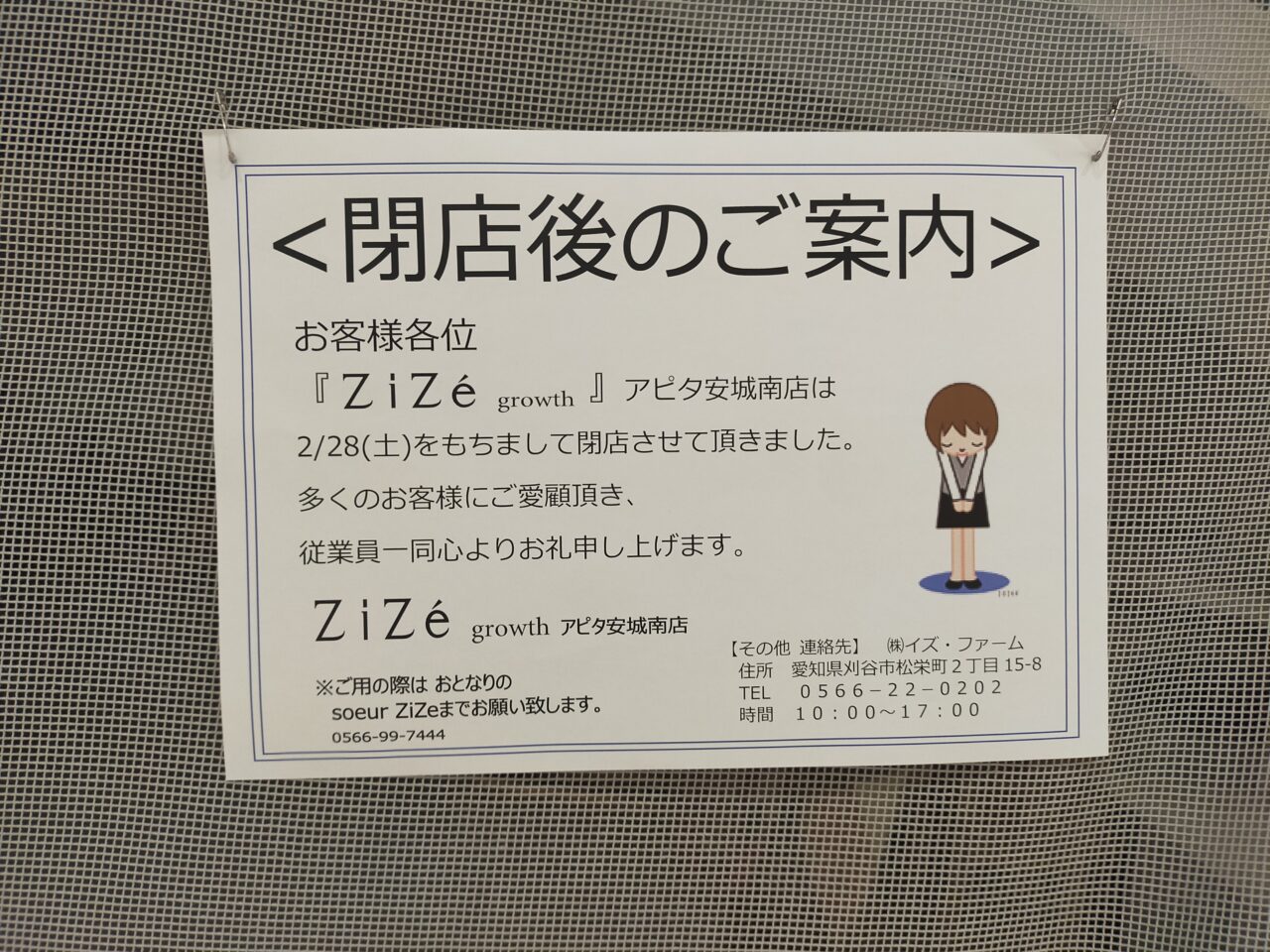 さらに、同じアピタ安城南店の2階で営業していたファッションセレクトショップ「ZiZé growthアピタ安城南店」さんが、2026年2月28日をもって閉店したことが明らかになりました。