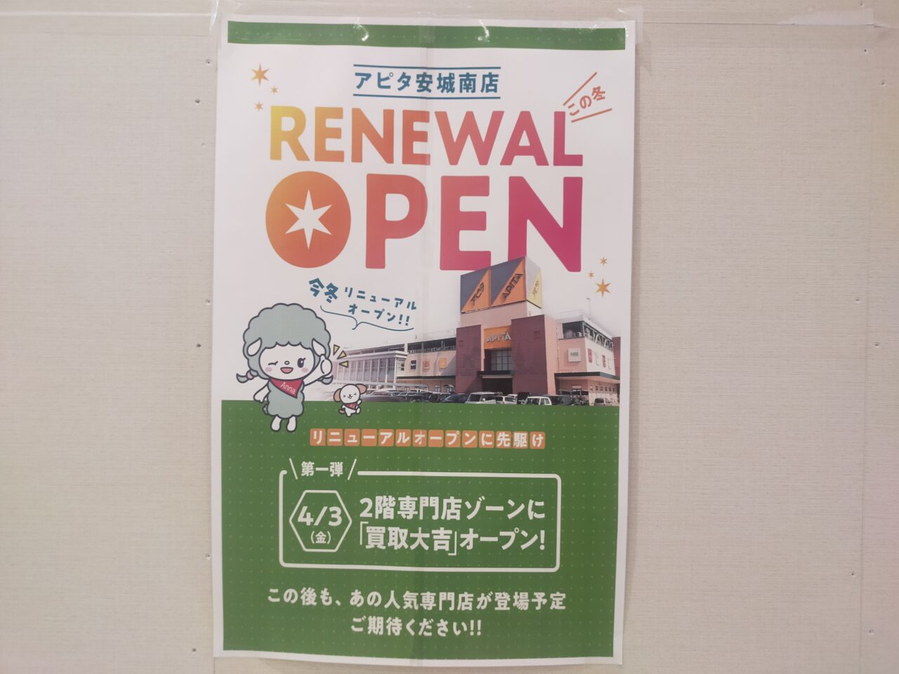 また、アピタ安城南店は、今冬リニューアルオープンを予定されているそうで、こちらのチラシにてご案内が出ています↓