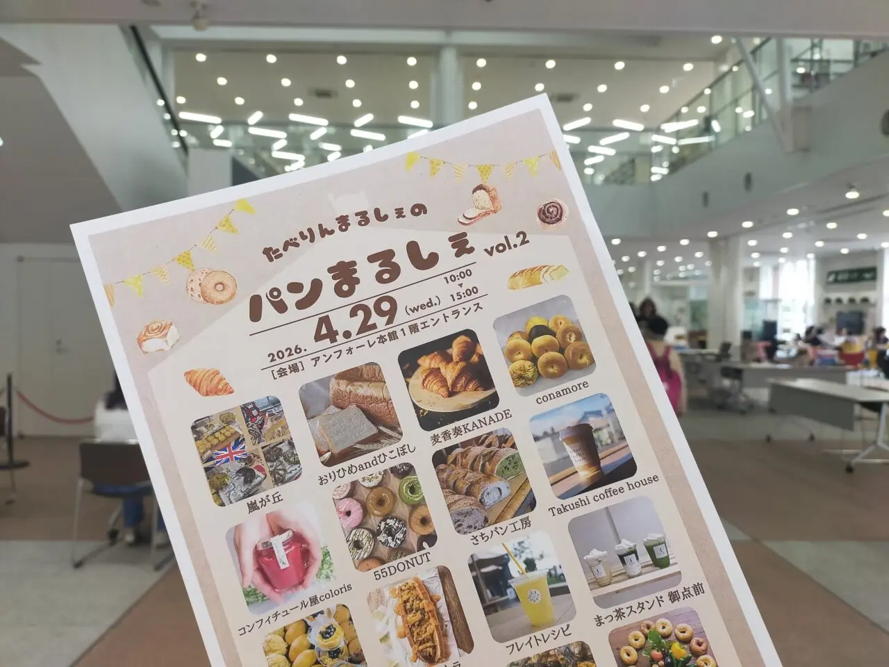 2026年4月29日に、パンやベーグル、カフェドリンクの人気店が集まる「たべりんまるしぇのパンまるしぇvol.2」が、アンフォーレで開催されます。